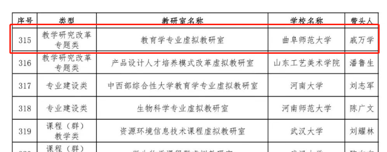 曲阜师大新闻中心讯 近日,教育部办公厅下发了《关于公布首批虚拟教研室建设试点名单的通知》,我校戚万学教授领衔的教育学专业虚拟教研室获批教育部首批虚拟教研室试点建设项目,这是我校基层教学组织建设的重大突破。