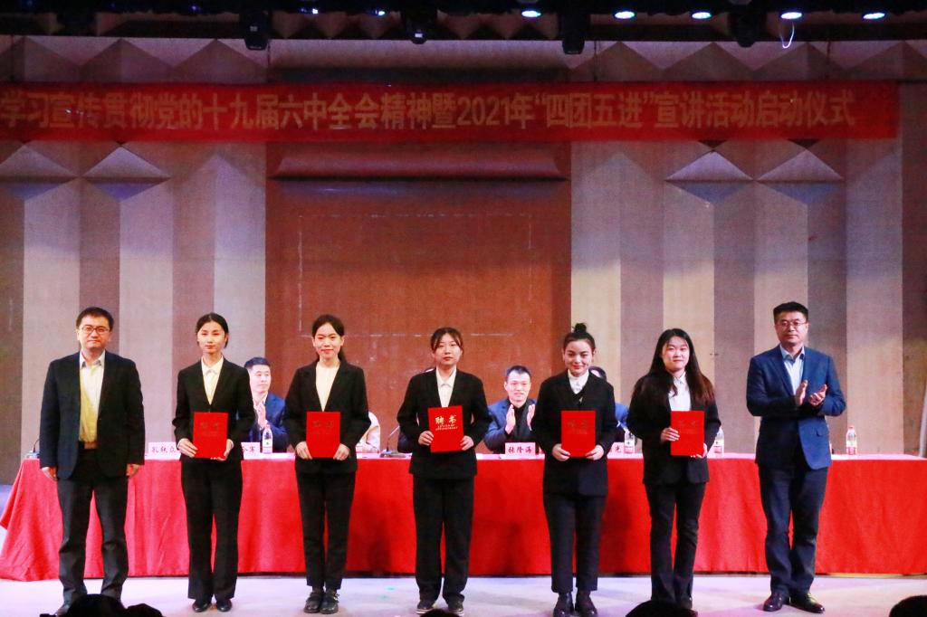 会上,马克思主义学院院长孙迪亮宣读了宣讲方案;学生工作处处长姜美颖和研究生处处长杜曙光分别宣读了教师宣讲团和研究生宣讲团的成员名单;张隆海和日照校区党委书记孔令军为教师宣讲团讲师代表颁发了聘书;日照校区办公室主任魏伟和学校团委书记孔轶众为研究生宣讲团团长颁发了聘书;教师宣讲团代表汤锐副教授做了教师代表发言。