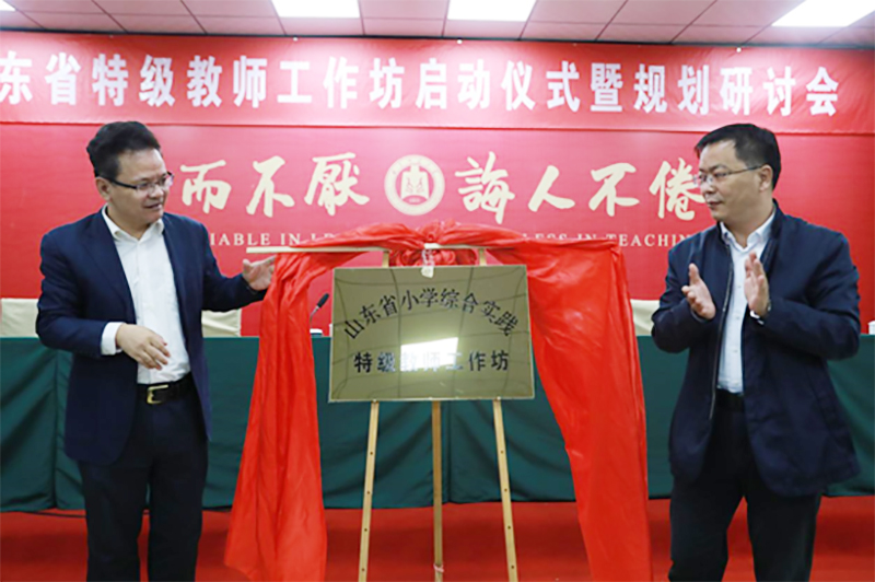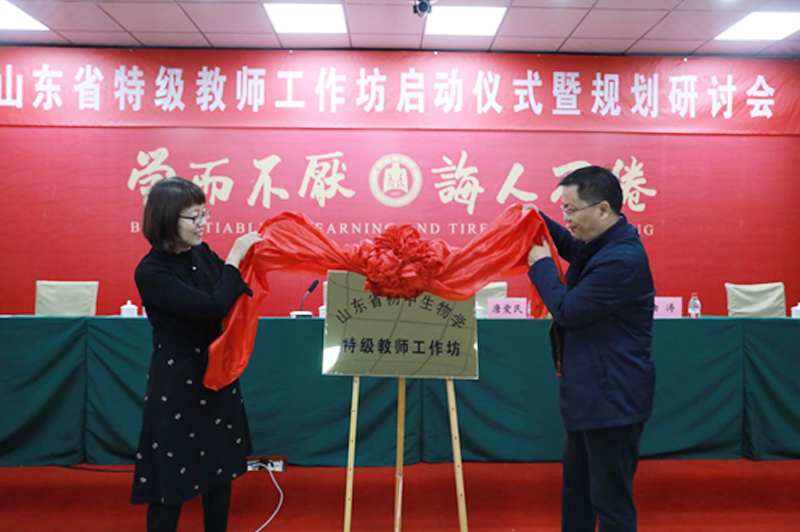 白涛宣读了《山东省教育厅关于公布山东省特级教师工作坊成员名单的通知》。教育学院院长唐爱民、生命科学学院院长王仁君分别对小学综合实践特级教师工作坊和初中生物学特级教师工作坊的任务、功能作了解读。随后,胡钦晓与唐爱民为“小学综合实践特级教师工作坊”揭牌,胡钦晓与王仁君为“初中生物学特级教师工作坊”揭牌。