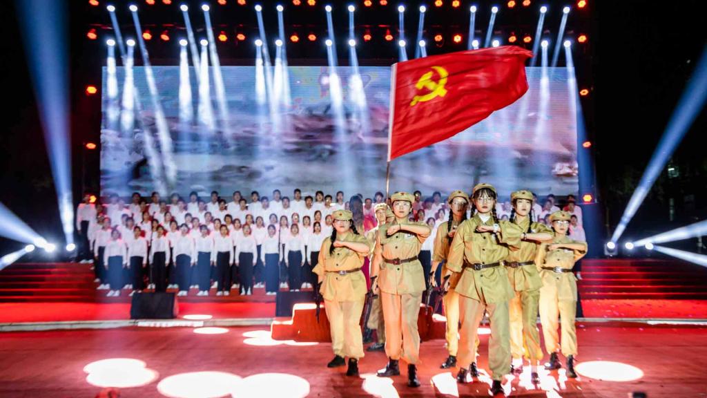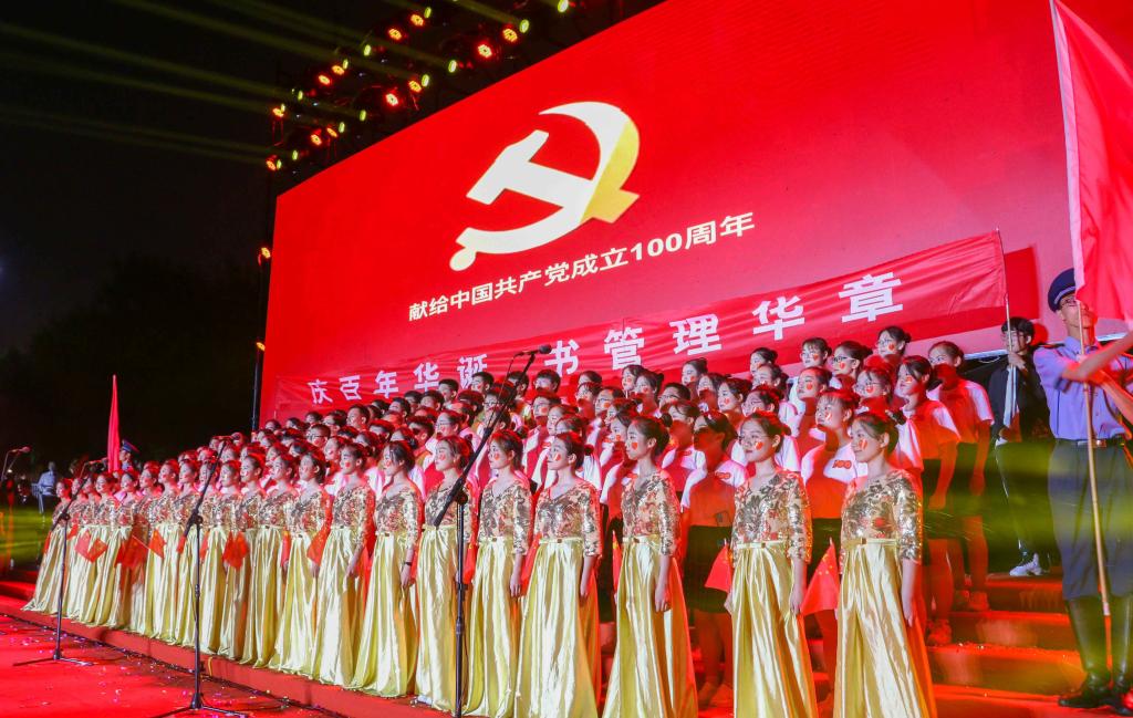 演出中,师生们的歌声或激越高昂、气势澎湃,或婉转悠扬、韵味典雅,辅以绚丽多彩的服装和舞台设计,融合优美的舞蹈表演和生动的情景短剧,并通过背景大屏幕上的一组组标志性画面呈现党的奋斗足迹和丰功伟绩,全方位打造了一场精彩的视听盛宴。