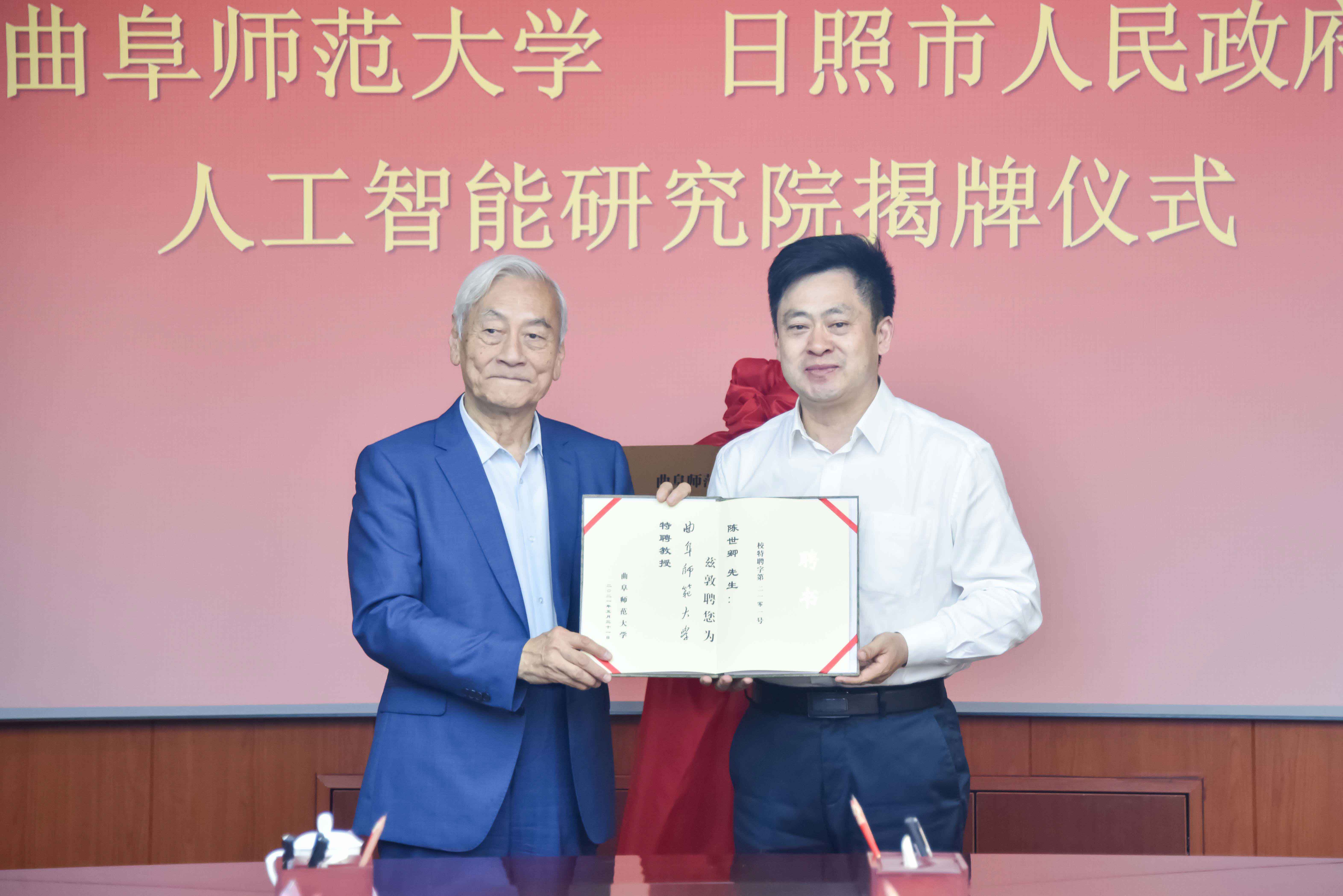 曲阜师大新闻中心讯(记者:李文振 摄影:李文振) 6月1日上午,由大发平台与日照市政府共建的人工智能研究院揭牌成立,美国国家工程院院士、美国艺术与科学院院士陈世卿教授加盟担任研究院院长,曲阜师大党委书记戚万学与陈世卿院士共同为研究院揭牌,戚万学同时为陈世卿院士颁发了特聘教授聘书。