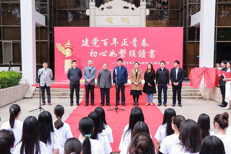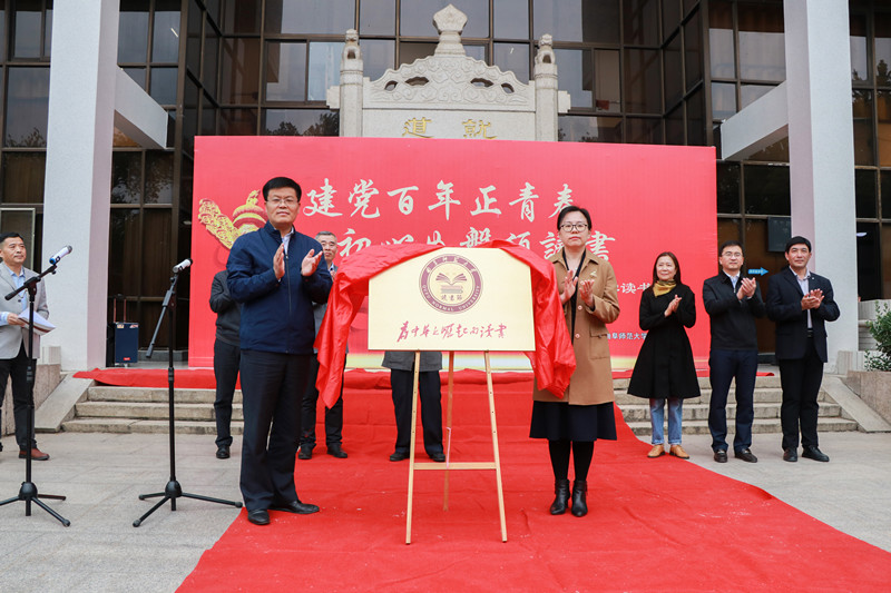 历史文化学院弓姝晗同学代表全校学生宣读倡议书。党委常委、副校长卢国强和学生工作处处长姜美颖共同为大发平台读书节揭牌。