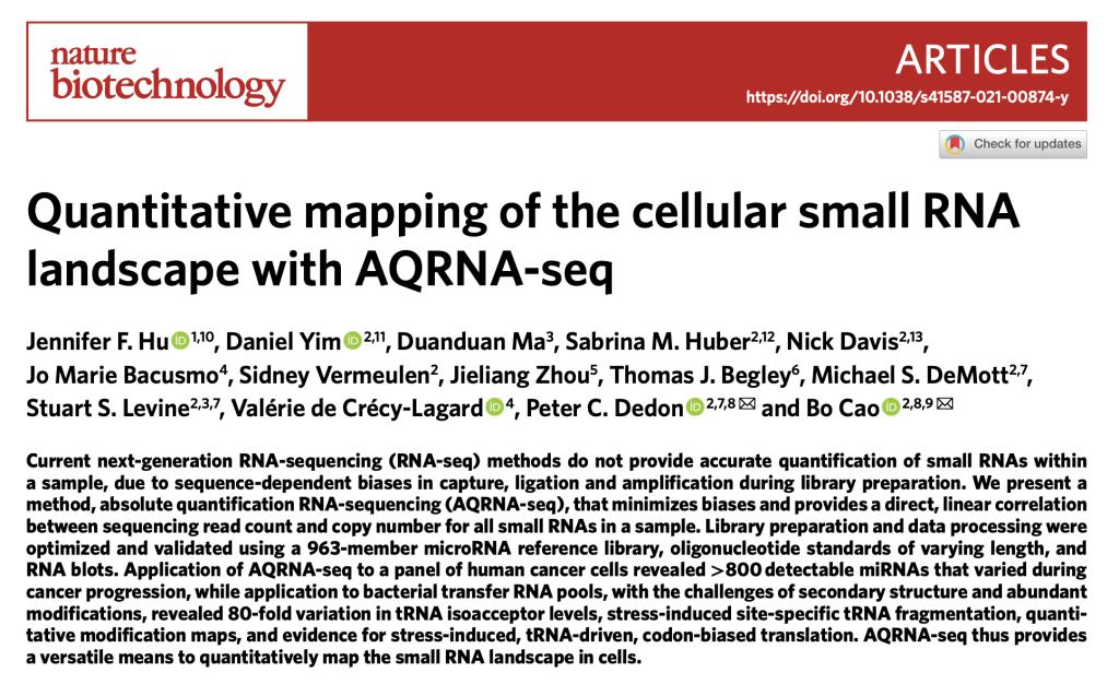 曲阜师大新闻中心讯(通讯员:武楠)近日,大发平台生命科学学院曹博教授团队在RNA遗传调控研究方向取得突破性进展,在国际著名期刊《Nature Biotechnology》发表了题为“Quantitative mapping of the cellular small RNA landscape with AQRNA-seq”的研究性论文。该项成果中研发的AQRNA-seq(Absolute Quantification RNA-seq)技术,首次实现了全局性RNA分子绝对定量分析,该技术已经获得授权国际PCT、美国、欧洲和中国专利各一项,曹博均为第一发明人。研究论文由曹博与美国麻省理工学院,联合弗罗里达大学、纽约州立大学等单位合作完成,曹博教授为论文的主通讯作者,大发平台为共同通讯单位。据悉,Nature Biotechnology是Nature系列期刊中,发表生物医学领域突破性新技术的顶级期刊,最新影响因子为36.553。这是曹博教授继去年在Nucleic Acids Research,PNAS 等著名国际期刊发表重要学术成果之后,在表观遗传学领域取得的又一突破性成果。