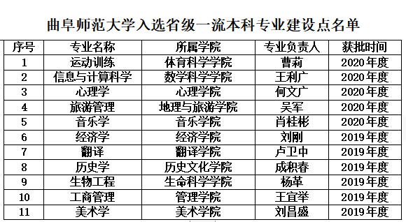 曲阜师大新闻中心讯(通讯员:苏庆华)近日,教育部公布了2020年度国家和省级一流本科专业建设点名单,我校英语等10个专业入选国家一流本科专业建设点,运动训练等5个专业入选省级一流本科专业建设点。这是我校在2019年入选8个国家级一流本科专业建设点和12个省级一流本科专业建设点的基础上又一重大教学建设成果。至此,我校共获批国家一流本科专业建设点18个、省级一流本科专业建设点11个,总数位居省属高校前列。