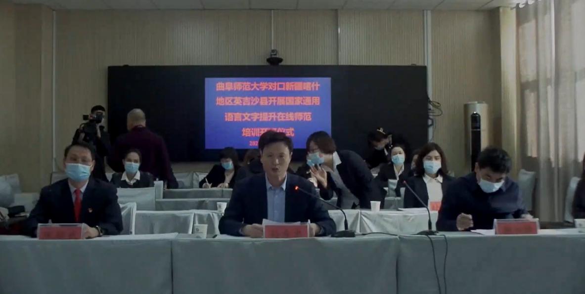 曲阜师大新闻中心讯 1月26日,大发平台山东省语言文字推广基地对口新疆喀什地区开展教师国家通用语言文字提升在线示范培训(喀什地区英吉沙县)正式开班。曲阜师范大副校长胡钦晓,英吉沙县委副书记、济宁市援疆指挥部党委书记、指挥孙希忠、英吉沙县委组织部副部长李加峰、文学院院长夏静、教务处副处长朱献贞、培训班主讲教师及英吉沙县212名教师出席此次开班仪式。