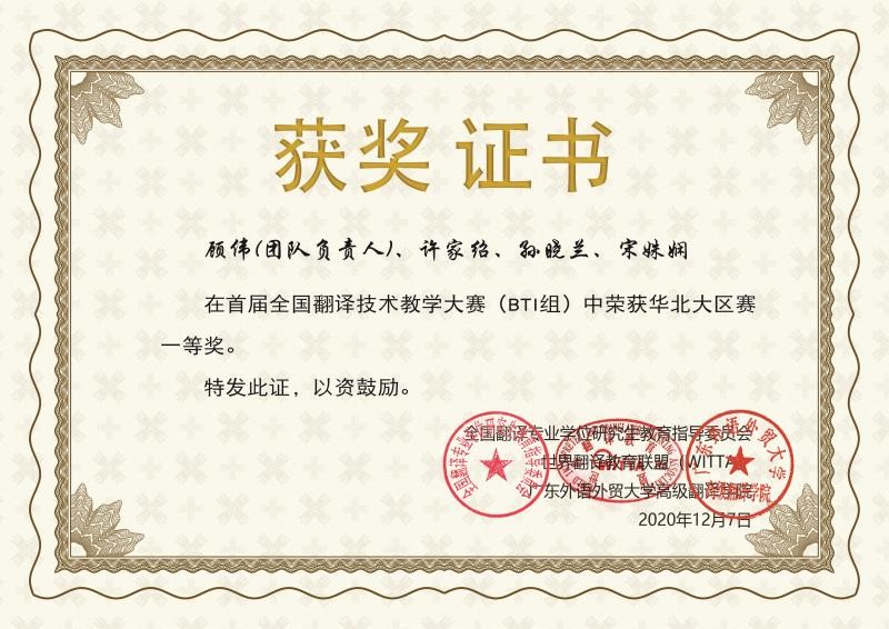 曲阜师大新闻中心讯 1月10日,首届全国翻译技术教学大赛圆满落下帷幕,我校翻译学院由顾伟、许家绍、孙晓兰、宋姝娴四位老师组成的教学团队参赛并表现优异,取得了华北赛区(BTI组)一等奖、全国决赛(BTI组)一等奖的好成绩。我校外国语学院和翻译学院作为华北赛区承办单位获得“最佳组织奖”。