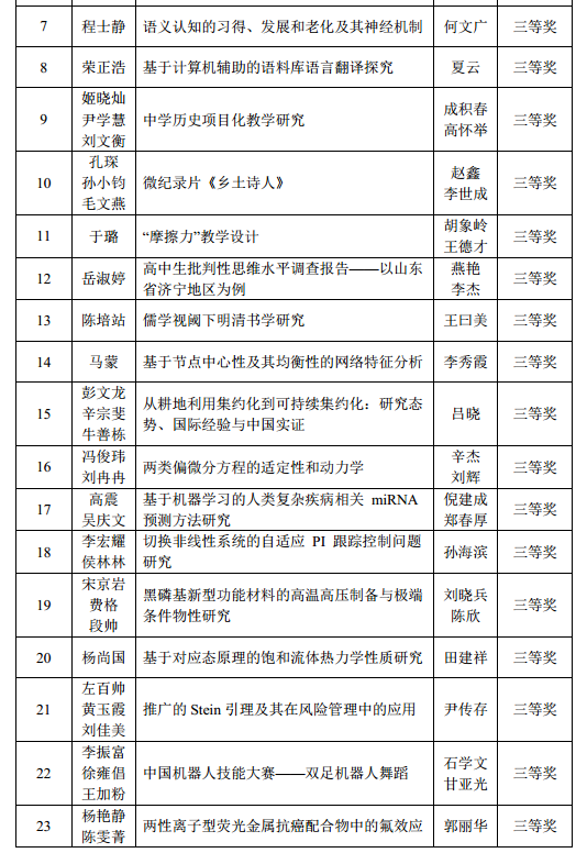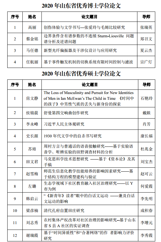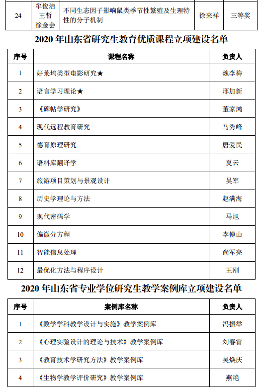 曲阜师大新闻中心讯(通讯员:臧付伟) 2020年12月30日,山东省教育厅公布了《关于公布2020年山东省优秀博士硕士学位论文和研究生优秀成果奖名单的通知》(鲁教研函〔2020〕5 号)、《关于公布2020年山东省研究生教育优质课程和专业学位研究生教学案例库立项建设名单的通知》(鲁教研函〔2020〕6号)。曲阜师大推荐的山东省省优秀博士学位论文、研究生优秀成果奖,研究生教育优质课程、专业学位研究生教学案例库等奖项项目均100%通过评审,获批山东省优秀博士论文4篇,优秀硕士论文23篇,研究生优秀成果奖24项(一等奖1项、二等奖5项、三等奖18项),研究生教育优质课程和专业学位研究生教学案例库评选各获批12项。