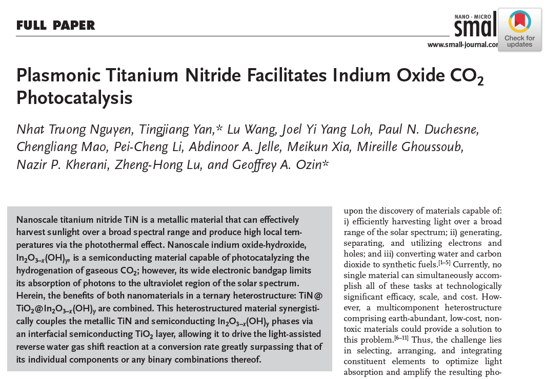 2020年11月,颜廷江教授与Ozin教授继续合作,将SFLPs型In2O3-x(OH)y与具有金属特性的TiN材料耦合,经过煅烧处理后,所得复合催化材料TiN@TiO2@In2O3−x(OH)y可以在较宽的光谱范围内收集阳光,并透过光热效应产生高的局部温度,使其能够以极大超过单个组分或任何二元组分的转化率驱动光激活水气变换反应。相关研究成果以“Plasmonic Titanium Nitride Facilitates Indium Oxide CO2 Photocatalysis”为题发表在国际著名刊物Small(影响因子11.459)。大发平台为论文的通讯署名单位。