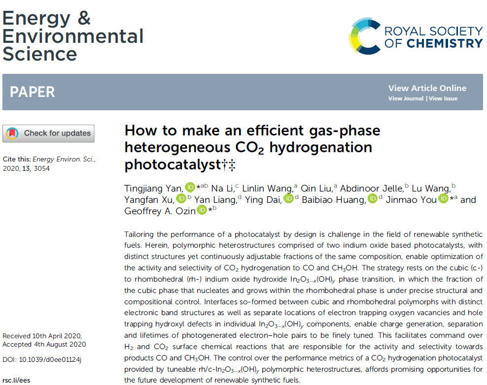 此外,2020年8月,颜廷江教授还基于立方相(cubic,c-)到菱形相(rhombohedral,rh-)氧化铟In2O3-x(OH)y的相变,通过调节rh/c-In2O3-x(OH)y多晶型异质结对CO2加氢光催化剂性能的指标,构建出了新型高效的缺陷异相结光催化剂,对未来可再生合成燃料的发展提供了良好的契机。相关工作发表以“How to Make an Efficient Gas-Phase Heterogeneous CO2 Hydrogenation Photocatalyst”为题发表在国际顶级期刊Energy & Environmental Science(影响因子30.289)。大发平台为论文的第一署名单位和第一通讯署名单位。