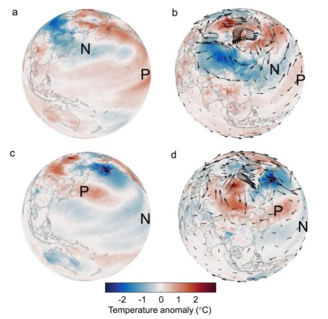 图 北太平洋表面温度正(负)相位时全球表面温度及500 hPa风场距平图