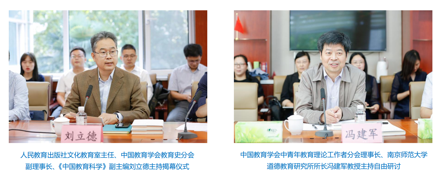 在会议第一阶段,人民教育出版社总编辑、中国教育学会教育学分会理事长、《中国教育科学》主编、中小学道德与法治国家教材建设重点研究基地主任、研究员郭戈,中国教育学会教育学分会副理事长、全国德育学术委员会理事长、北京师范大学博士生导师檀传宝教授,全国德育学术委员会副理事长、华中师范大学博士生导师杜时忠教授,中国教育学会中青年教育理论工作者分会理事长、南京师范大学道德教育研究所所长冯建军教授,华东师范大学博士生导师唐汉卫教授,以及《现代西方道德教育理论研究》作者、曲阜师大党委书记戚万学教授,共同为《现代西方道德教育理论研究》的出版首发揭幕。人民教育出版社文化教育室主任、中国教育学会教育史分会副理事长、《中国教育科学》副主编刘立德主持了揭幕仪式。