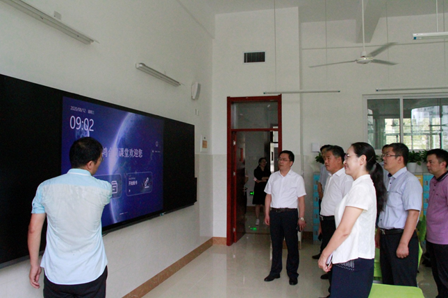 调研中,学校领导详细了解第一附属小学目前的建设、招生等相关情况,并实地视察了智慧教室、科学实验室、图书阅览室等场所。