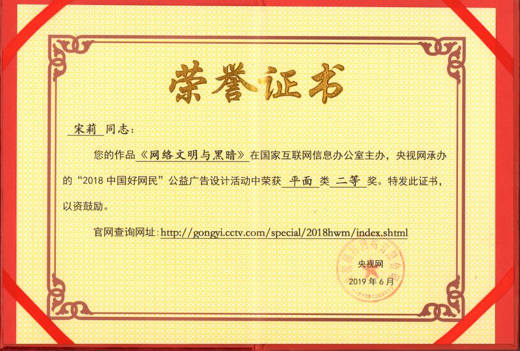 近日,“2018中国好网民”公益广告设计活动顺利落幕。本次活动由国家互联网信息办公室指导,中央广播电视总台主办,央视网承办,中国好网民互动平台、人民网、新华网、中国网、中国青年网、光明网等协办。由我校传媒学院教师孔勇指导的数字媒体艺术专业学生宋莉在本次大赛中获得二等奖,并得到0.5万元奖金及免费参加央视内部高端培训的资格。