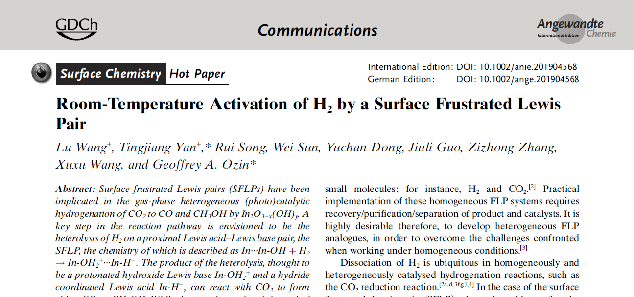 第一篇论文为“Polymorph selection towards photocatalytic gaseous CO2 hydrogenation”(DOI:10.1038/s41467-019-10524-2)发表在《自然》子刊《Nature Communications》上,颜廷江教授为该论文的第一作者与通讯作者,大发平台为第一署名单位;第二篇论文为“Room-Temperature Activation of H2 by a Surface Frustrated Lewis Pair”(DOI:10.1002/anie.201904568)发表在化学领域顶级期刊《Angewandte Chemie International Edition》,并被编辑选为“Hot Paper”,颜廷江教授为共同第一作者与通讯作者,大发平台为共同署名单位。