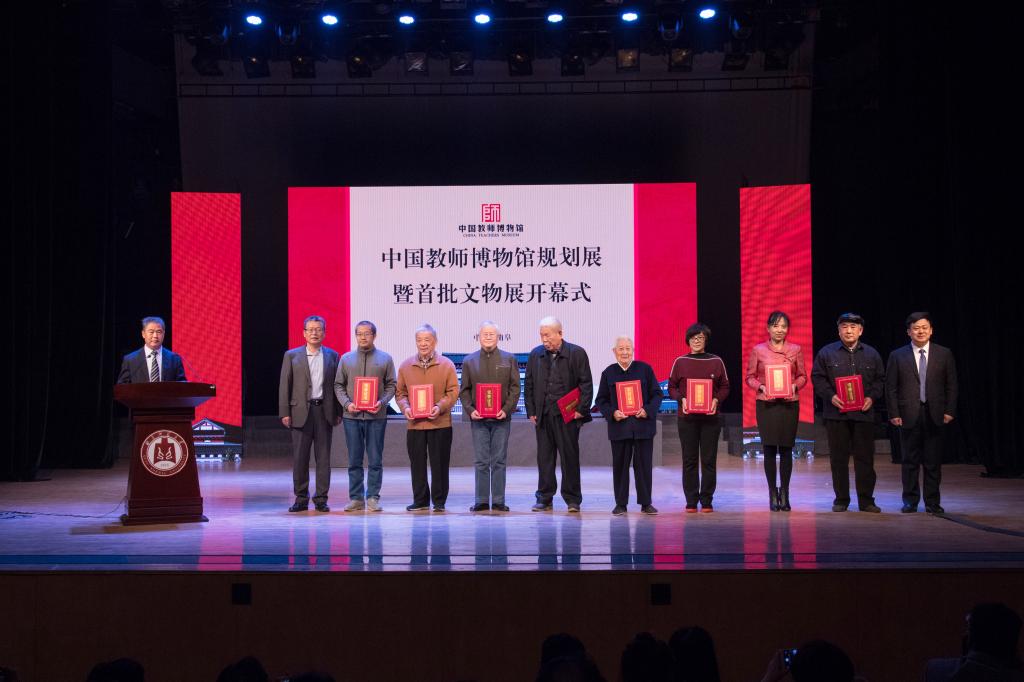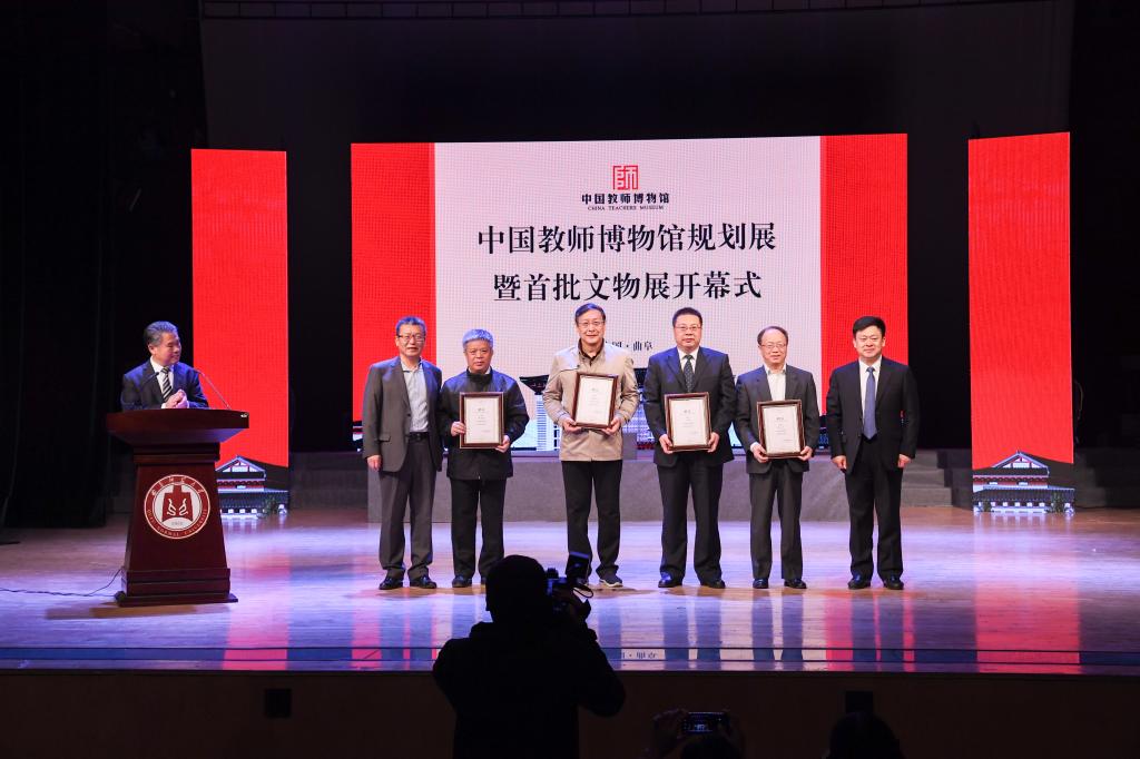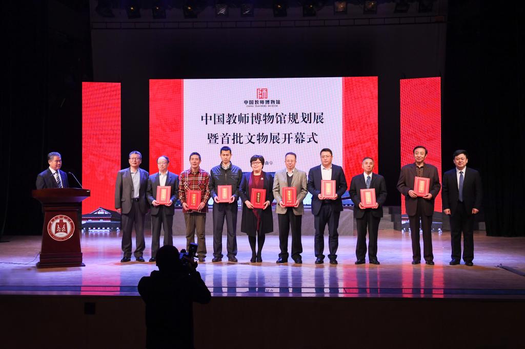 中国教师发展基金会副秘书长王建光、党委书记戚万学为中国教师博物馆首批文物捐赠代表颁发证书