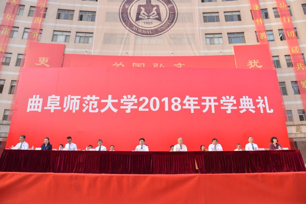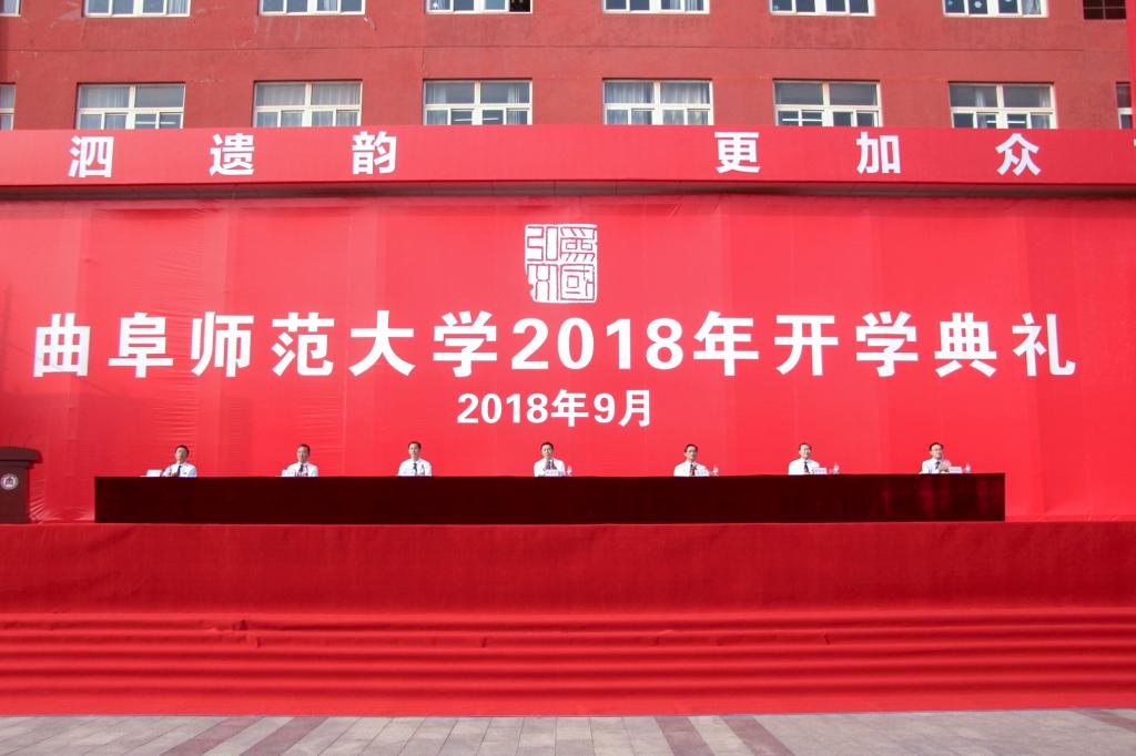 典礼在庄严的国歌声中拉开帷幕,现场隆重而热烈。由2018级新同学组成的缤纷方阵举目望去,“为国弘文”四个大字鲜艳夺目,彰显着曲园人的文化自觉与文化自信;典礼主席台两侧,“犹有洙泗遗韵,更加众志成城”——63年前首次开学典礼上的“创校宣言”,以历史的神圣与厚重,昭示着曲园人奋进新时代、建设孔子家乡一流大学的决心与担当。