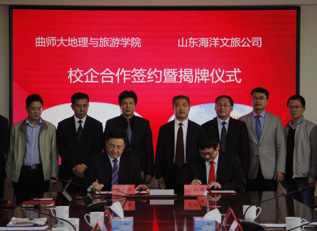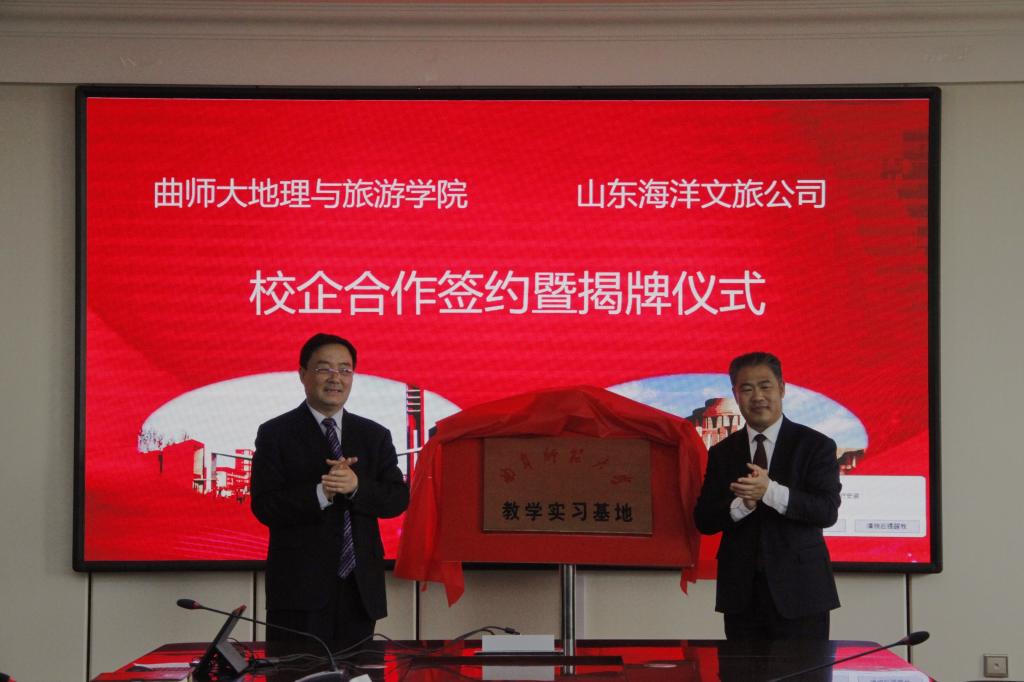4月26日上午,我校与山东海洋文化旅游发展有限公司签订校企合作协议并举行教学基地揭牌仪式,副校长扈庆学,山东海洋文化旅游发展有限公司党委书记、董事长赵东江,总经理古茂林出席仪式。地理与旅游学院、日照校区管理办公室、山东海洋文化旅游发展有限公司等单位相关负责人以及师生代表参加了活动。