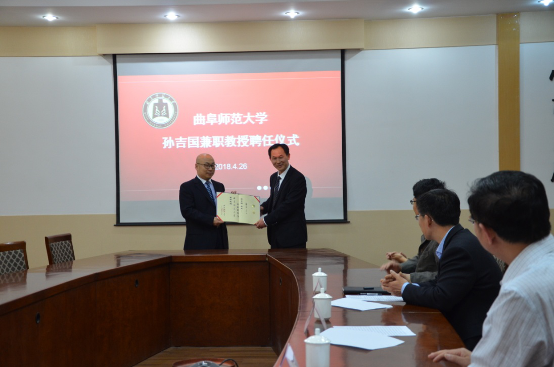4月26日下午,山东省区域文化产业研究院院长、山东省高端智库人才入库专家孙吉国研究员被聘为我校兼职教授。副校长辛杰出席活动并向孙吉国颁发兼职教授聘书,国内合作处、历史文化学院、人事处负责人等参加了活动。