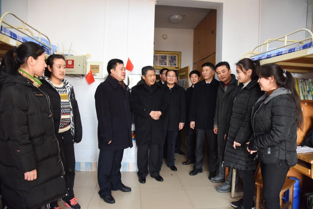 1月9日,党委书记戚万学在日照校区调研期间,专程来到文泽园宿舍区,看望慰问青年大学生。副校长扈庆学及有关单位负责同志参加了活动。