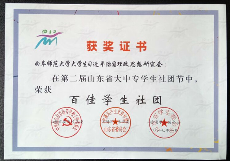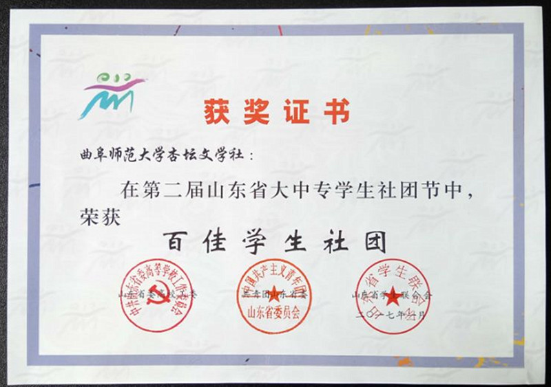 近日,省高校工委、团省委、省学联对第二届山东省大中专学生社团节中表现突出的单位和社团进行了表彰,我校获“优秀组织奖”,学生社团杏坛文学社、大学生习近平治国理政思想研究会获“百佳学生社团”荣誉称号。