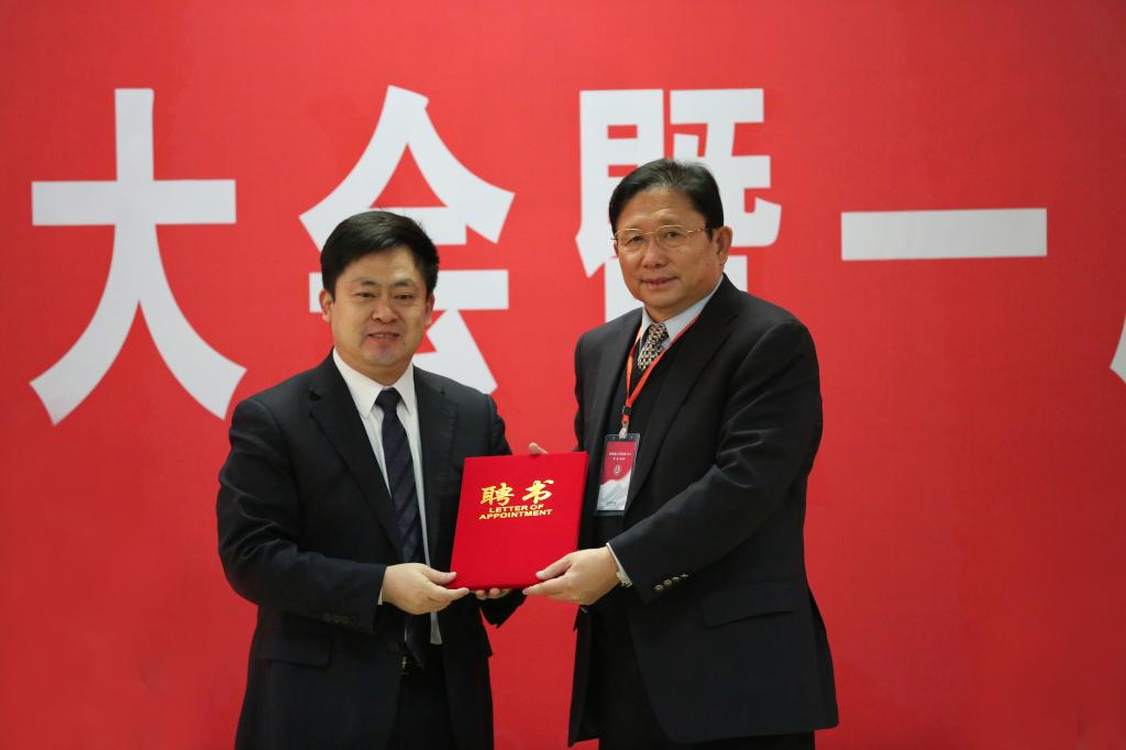 学校第一届理事会理事长、学校党委书记戚万学为理事会理事颁发了聘书。