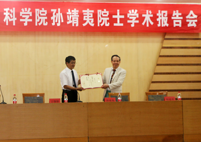 王继锁为孙靖夷院士颁发聘请证书,聘请孙靖夷院士为大发平台软件学院兼职教授,并希望软件学院能在孙靖夷院士的带领下不断进步,快速成长。
