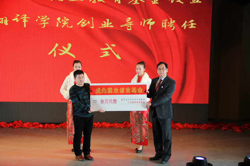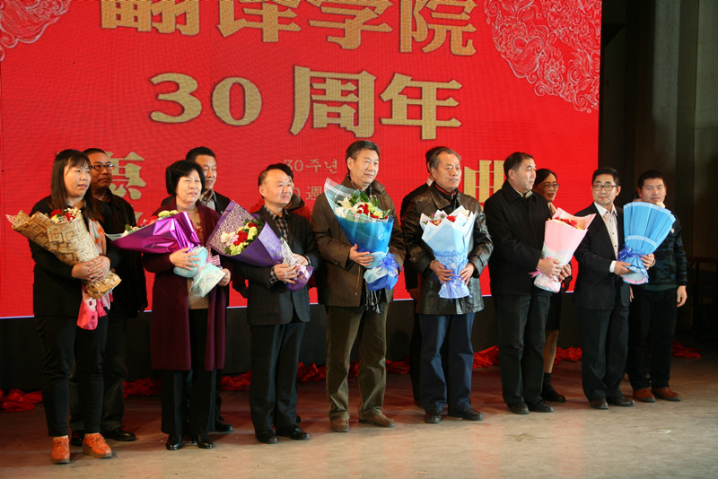 一段社会各界人士为翻译学院送祝福的视频集锦拉开了本次晚会的序幕。晚会伊始,1985级校友和在校生用诗朗诵的形式为大家带来了一场跨越三十载的对白,悠悠《犁牛之子》荡漾在舞台中央,也荡漾在每个翻译学子的心中;诗朗诵结束后,2015级同学为1985级师哥师姐们佩戴校徽,继而校友代表们为教师代表献上鲜花。三十年来,翻译学院为社会培养了大批外语人才。2004级校友张成先从上海专程赶来参加院庆活动,院长卢卫中对张成先董事长为学院捐赠创业教育基金表示感谢,并为他颁发大发平台翻译学院创业导师聘书。