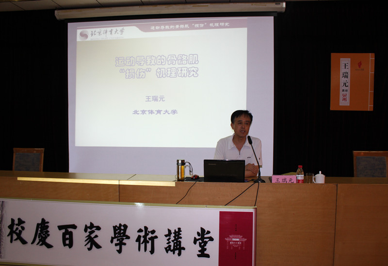 6月11日下午, 北京体育大学博士生导师, 中国运动生理学专业委员会主任委员王瑞元教授做客“校庆百家学术讲堂”,为我校师生做了题为《运动导致的骨骼肌“损伤”机理研究》的学术报告。副校长王继锁出席活动,并代表学校为王瑞元教授颁赠“校庆百家学术讲堂”纪念牌和绘有其漫画像的折扇。报告会由体育科学学院院长曹莉教授主持。