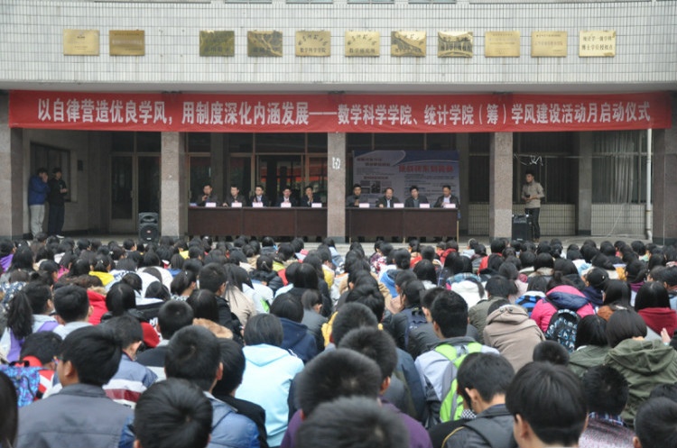 学风,是读书之风,是治学之风,更是做人之风,是学校的文明风气、人性管理和文化积淀,是一所学校的立校之本。为深化学院的学风建设,创造良好的学习氛围,11月5日下午, 数学科学学院、统计学院(筹)2014—2015学年第一学期学风建设活动月启动仪式在数学院楼前举行。党委副书记刘新生、学生工作处、教务处、团委以及数学科学学院、统计学院(筹)相关领导出席大会。会议由院党总支副书记王作茂主持,2014、2013级全体同学参加了本次活动。