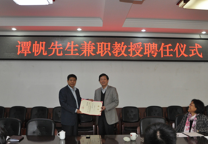 聘任仪式上,张隆海介绍了谭帆教授的简历和学术成就,并对谭帆教授加盟我校表示热烈欢迎。党委副书记刘新生代表学校为谭帆教授颁发了兼职教授聘书,并对他受聘我校表示祝贺。刘新生表示谭教授的加盟一定能促进我校的学科建设与发展,希望文学院的师生们学习谭教授的治学思想和学术方法,共同把文学院建设得更好。