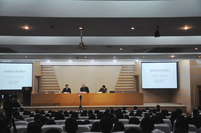 陆伯彬以不同历史阶段内中美关系的发展状况为主线,用其独特的乐观现实主义视角分析了中美两国关系的进程。陆教授分析了冷战之后中国的发展状况,指出冷战以来亚洲是世界上最稳定的地区,中国在该时期把握住了难得的和平发展机会,使得自身飞速发展,肯定了在此过程中中国的崛起及其在国际社会中日益重要的地位。之后,又通过中国南海等问题对现在的中美关系进行了分析,阐述了中美对朝鲜、日本、菲律宾等国家的对外政策和外交态度,分析了中美之间的冲突与合作,也指出了中美关系中存在的问题并对中美关系的未来作出了乐观的展望。最后,陆伯彬对现场同学提出的问题做了详细解答。