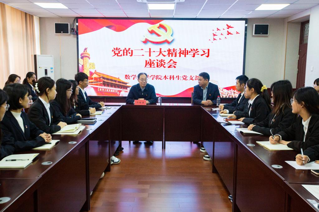 宣讲结束后,冯继康来到数学科学学院和师生们进行座谈交流,认真听取了大家学习领会党的二十大精神的感悟和收获,勉励青年学子牢记习近平总书记对于新时代青年的殷殷嘱托,从党的二十大精神中汲取成长成才的滋养,做到学有所悟、以学促行,坚定理想信念,抓好学业、练好本领,为奋进新征程贡献青春力量。