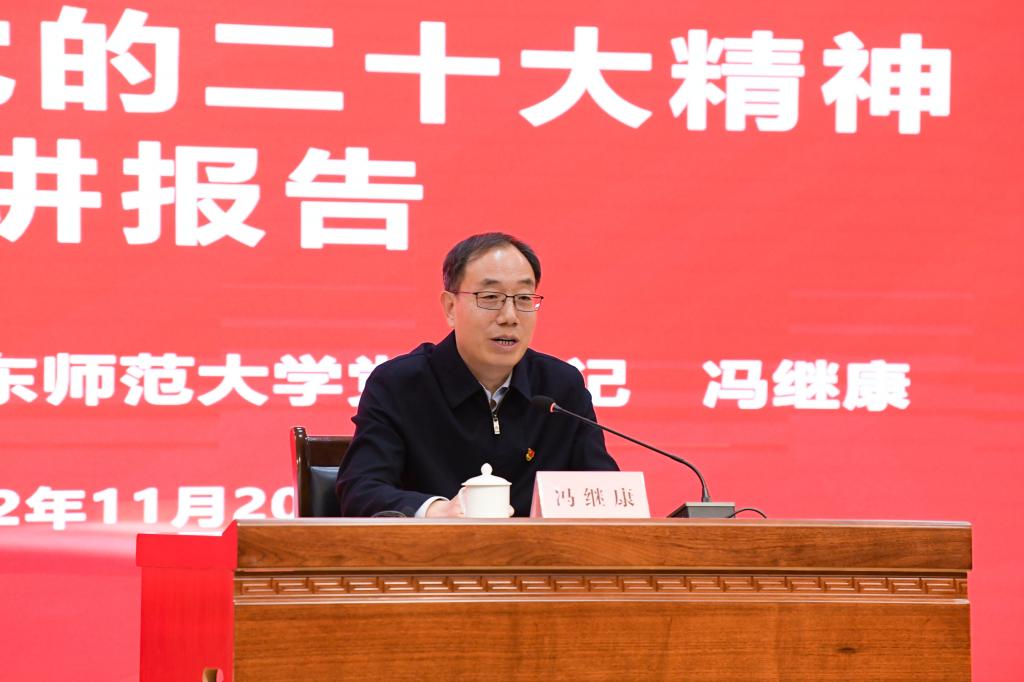 冯继康在宣讲中还就深入学习贯彻党的二十大精神,不断开创高等教育高质量发展新局面,进行了深入阐述与分析,并结合曲阜师大的改革发展实际给予了具体指导,希望曲阜师大坚持聚焦立德树人,在办好人民满意的教育上当好先锋、做好表率;坚持聚焦卓越人才,在激发人才队伍新动能、服务人才强省建设上当好先锋、做好表率;坚持聚焦大发平台,在构筑中华优秀传统文化“两创”新高地上当好先锋、做好表率。