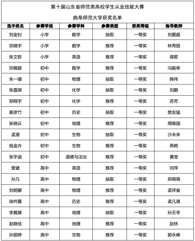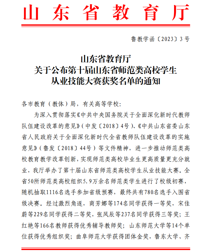 山东省师范类高校学生从业技能大赛自2013年以来已成功举办十届。曲阜师大始终贯彻“以赛促教、以赛促学、以赛促改”的大赛宗旨,高度重视这一大赛平台的育人育才作用,不断提升师范生培养质量,成为引领山东省师范类高校学生从业技能大赛的标杆学校,获得了省内外同类高校和社会各界的高度赞誉。