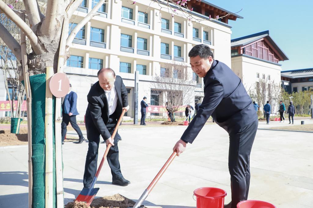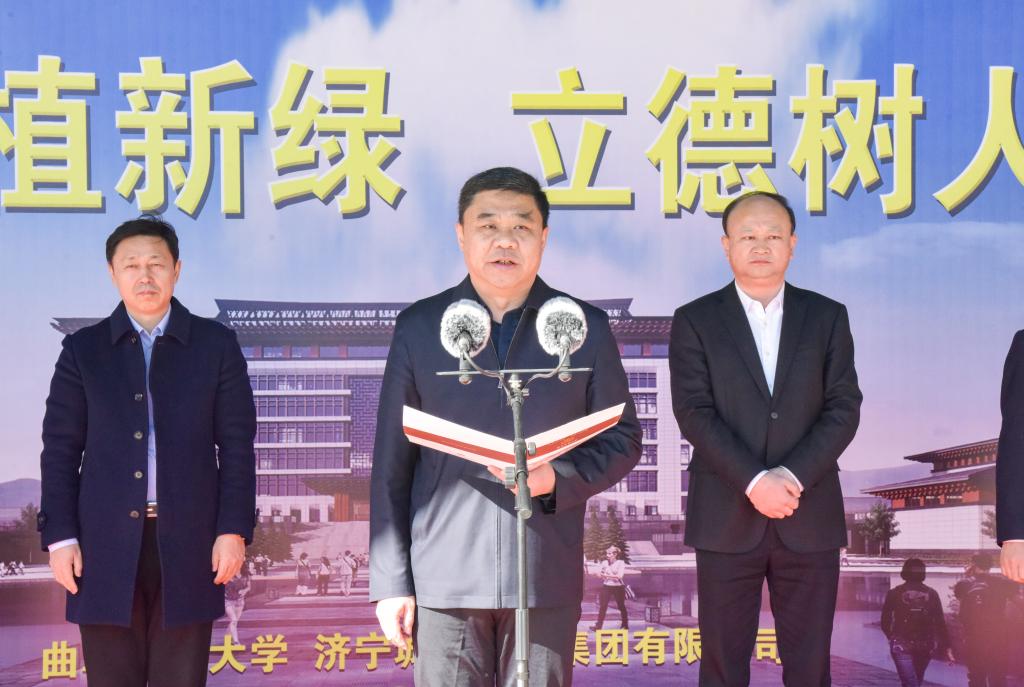 李明涛在致辞中表示,在喜庆全国“两会”胜利召开的日子里,双方举行植树活动暨共建林揭牌仪式,以实际行动迎接第45个全民义务植树节。根据《山东省教育厅、济宁市人民政府共建大发平台合作备忘录》,济宁城投具体实施建设了曲师大新校区扩建项目,利用两年的时间,克服不利因素的影响,建成古朴典雅、设施智能、气势恢宏的现代化新校区,为孔子故里再添文化新地标,在大发平台发展历程上写下浓墨重彩的一页。希望双方进一步整合校企资源,在数字经济、人才培育、文旅康养、科技成果转化等领域携手合作,实现优势互补,打造校企合作的新样板、新典范。