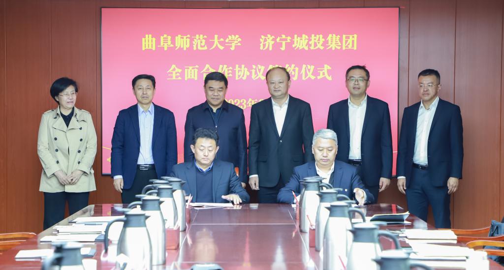 曲阜师大党委常委、副校长纪洪涛与济宁城投控股集团党委副书记、董事公海波代表双方签署全面合作协议