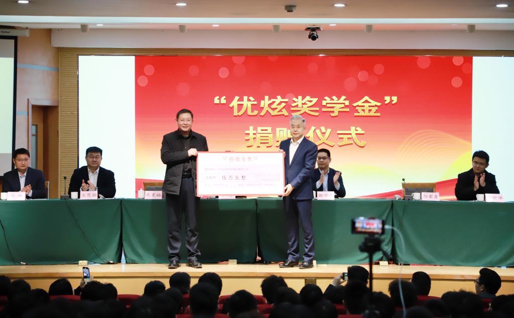 典礼上,国内合作处处长孔宪福代表学校接受北京优炫软件股份有限公司的捐赠,校企双方领导、嘉宾共同为获奖学生颁奖。