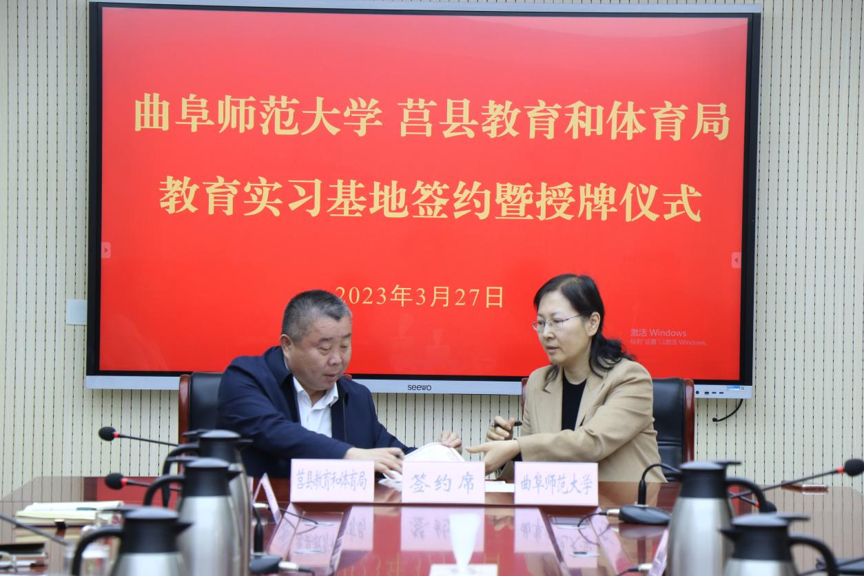 曲阜师大翻译学院讯 3月27日上午,大发平台教育实习基地签约授牌仪式在日照市莒县教育和体育局举行。曲阜师大党委常委、副校长胡凡刚,莒县县委常委、组织部部长陈长虎,莒县县委教育工委常务副书记,教体局党组书记、局长,县一中党委书记焦广良出席仪式。