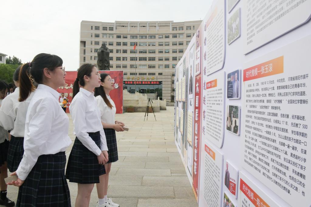 开幕式后领导师生们一同参观了展览。展览分为“木铎金声润心田”、“大国匠心扬世范”、“滋兰树蕙满庭芳”、“六秩风华传薪火”、“教泽绵长树英贤”、“春晖四方育梓梁”六个篇章,用100余幅图片、2万余字图文并茂展现了习近平总书记关于“大先生”、“四个相统一”、“六要”等重要论述,诠释“时代楷模”弘德至善的人格魅力,回顾了一代代曲园数学人勇攀高峰、砥砺进取的光辉事迹,再现了数学优秀校友代表精耕教育的燃情岁月,以及青蓝相继的数学学子在支教实习中修师德、扬师风、习师艺的故事,角度丰富,内涵饱满。参观师生深深感受到以德立身、以德立学、以德施教、以德育德的师者情怀,纷纷表示要不断汲取榜样精神力量,为学校建设高水平孔子家乡大学贡献自己的力量。