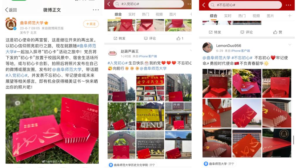 写好“初心卡”,砥砺向前行。学校党委组织部联合学校“漾YOUNG美育空间”工作室创新设计了“党员初心卡”,分发到全校学生党员手中。“入党时间是哪天”“入党初心是什么”“党员承诺是什么”……在填写初心卡的过程中,学生党员们在一次次自问中回味入党初心。学校官方微博创设“入党初心”话题,学生党员拍照晒出自己的“初心卡”,赢得纷纷点赞。微博上的大发平台“不忘初心”话题的阅读量高达65万多,讨论次数1000余次,取得了良好的活动热度。