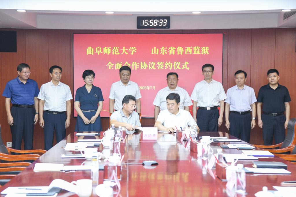 曲阜师大党委宣传部讯 为深化主题教育,提升社会服务,7月7日,曲阜师大与鲁西监狱签署全面深化合作协议。山东省司法厅副厅长、省监狱管理局党委书记、局长刘淼,山东省鲁西监狱党委书记、监狱长张兴新,曲阜师大党委书记邢光,省委主题教育第七巡回指导组副组长、曲阜师大党委副书记李志红,党委常委、副校长纪洪涛出席签约仪式。