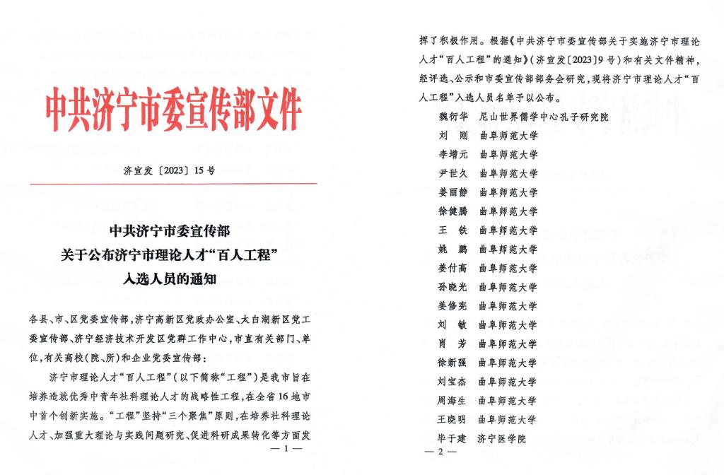 曲阜师大党委宣传部讯 近日,济宁市委宣传部印发了《关于公布济宁市理论人才“百人工程”入选人员的通知》,曲阜师大刘刚、李增元、尹世久等5位省级理论人才“百人工程”成员和姜付高、刘敏、肖芳等11名专家学者入选,入选人员数量位居济宁市各单位首位。
