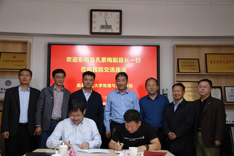曲阜师大地理与旅游学院党委书记苏占兵、院长张全景、党委副书记刘伟、副院长吴军、副院长于伟以及教师代表参加座谈。张全景在座谈中介绍了学院基本情况,王海峰介绍了东明县师资队伍建设情况,张洪洲介绍了东明一中办学情况。张全景和张洪洲签署了教育实习基地合作协议书。