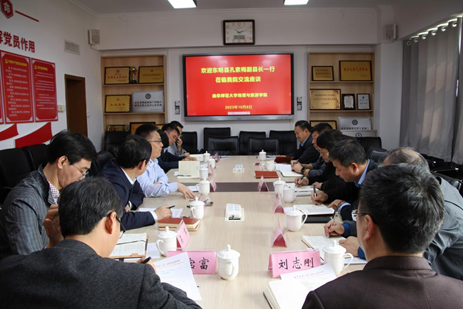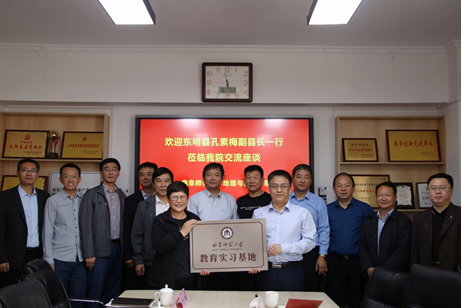 地理与旅游学院讯  10月8日上午,东明县副县长孔素梅、东明县教体局局长王海峰、东明一中校长张洪洲、东明一中副校长张景永、东明一中校长助理罗继军一行到曲阜师大访问交流。曲阜师大党委常委、副校长胡凡刚出席交流座谈活动。