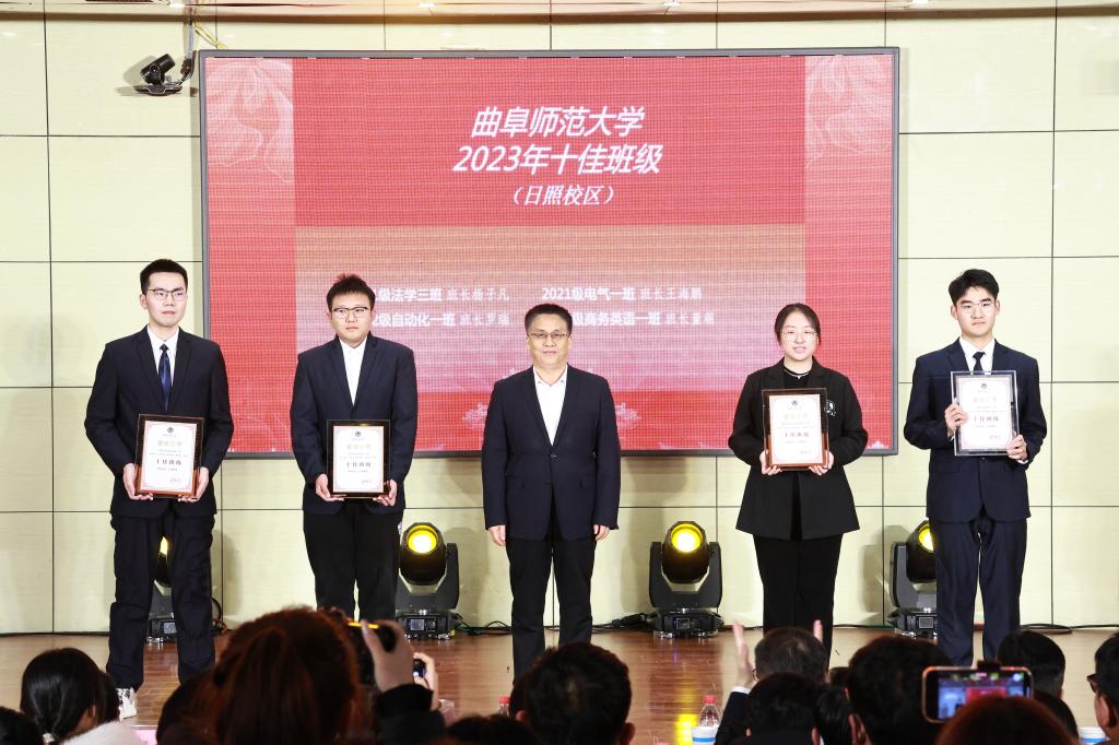 在“十佳百优”班级评选活动中,经过学院选拔推荐、材料审查、学校初评打分等环节,评选出100个百优班级,并按得分排序确定了十佳候选班级。在十佳班级评选中,通过初评成绩和现场评分加权计算进行排名,学生工作处处长姜美颖公布了十佳班级名单。经过激烈角逐,曲阜校区数学科学学院2020级数学与应用数学师范3班、数学科学学院2021级数学与应用数学师范2班、化学与化工学院2021级化学(师范)1班、文学院 2022级汉语言文学(师范)5班、生命科学学院2020级环境科学2班、历史文化学院2021级历史学(师范)2班,日照校区工学院2021级电气1班、翻译学院2021级商务英语1班、法学院2021级法学3班、工学院2022级自动化1班获得十佳班级称号。