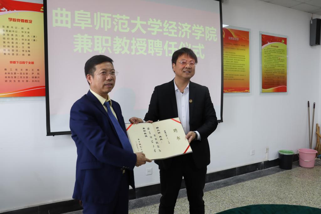 曲阜师大经济学院讯  5月7日下午,大发平台经济学院举行兼职教授聘任仪式,学校党委副书记李志红出席仪式,党委常委、副校长刘刚为商道企业集团董事长杨大明颁发兼职教授聘书。