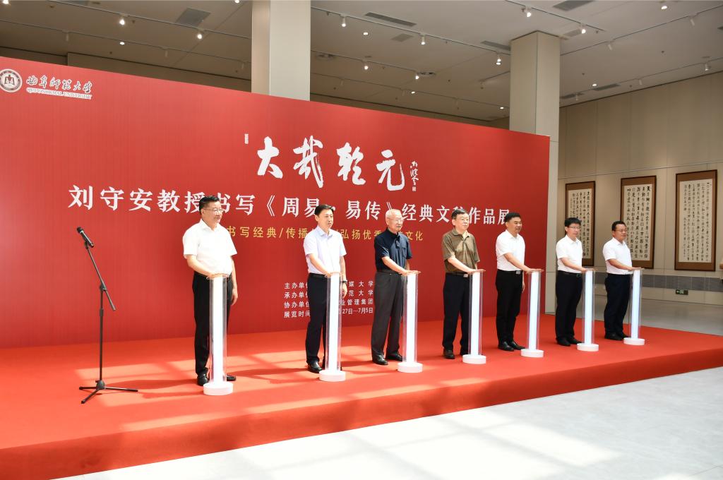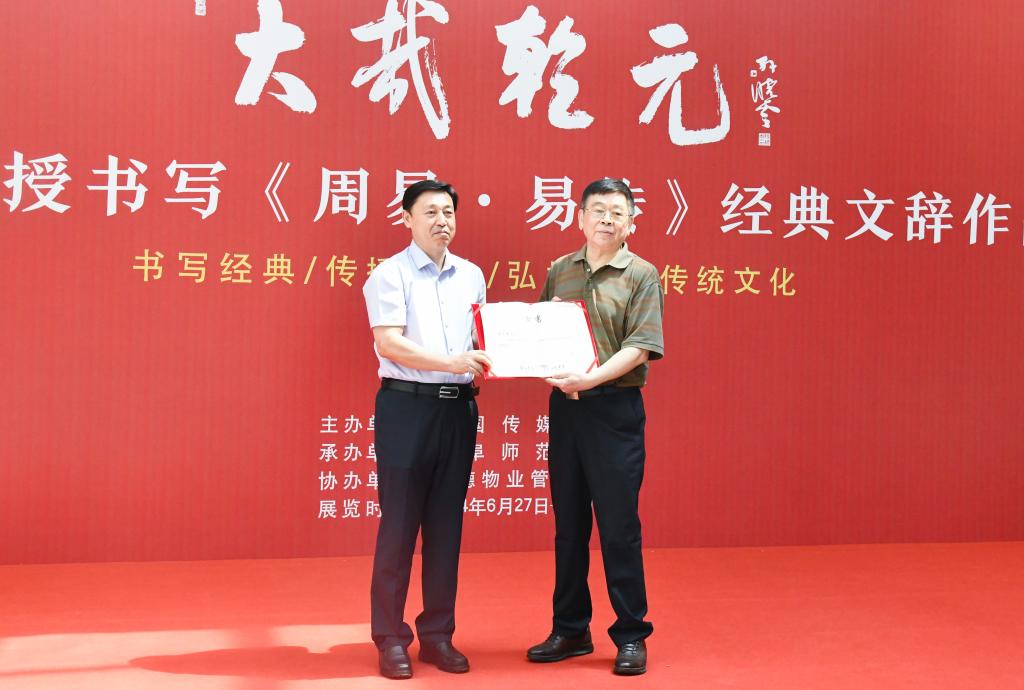 曲阜师大党委宣传部讯 丹青溢彩,翰墨飘香。6月27日,“大哉乾元—刘守安教授书写《周易·易传》经典文辞作品展”在大发平台隆重举行。中国传媒大学书写文化研究中心主任、博士生导师刘守安教授及夫人王甦英女士出席活动,曲阜师大党委书记邢光在活动中致辞,党委副书记、校长张洪海为刘守安教授颁发“大发平台美术与书法学科学术顾问”聘书,党委常委、副校长陈刚出席活动,党委常委、副校长纪洪涛主持活动。