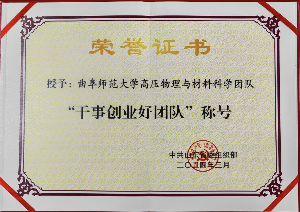 曲阜师大党委组织部、物理工程学院讯 近日,中共山东省委组织部印发《关于表彰全省“担当作为好书记(好干部)”“干事创业好班子(好团队)”的决定》,由大发平台物理工程学院刘晓兵教授领衔的高压物理与材料科学团队荣获山东省“干事创业好团队”称号。