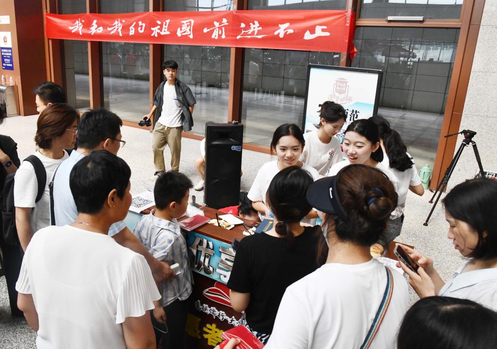大学生国旗护卫队将教师博物馆珍藏的教师节在天安门升起的国旗请到现场,邀请旅客与国旗合影,点燃现场群众爱国爱党之情。