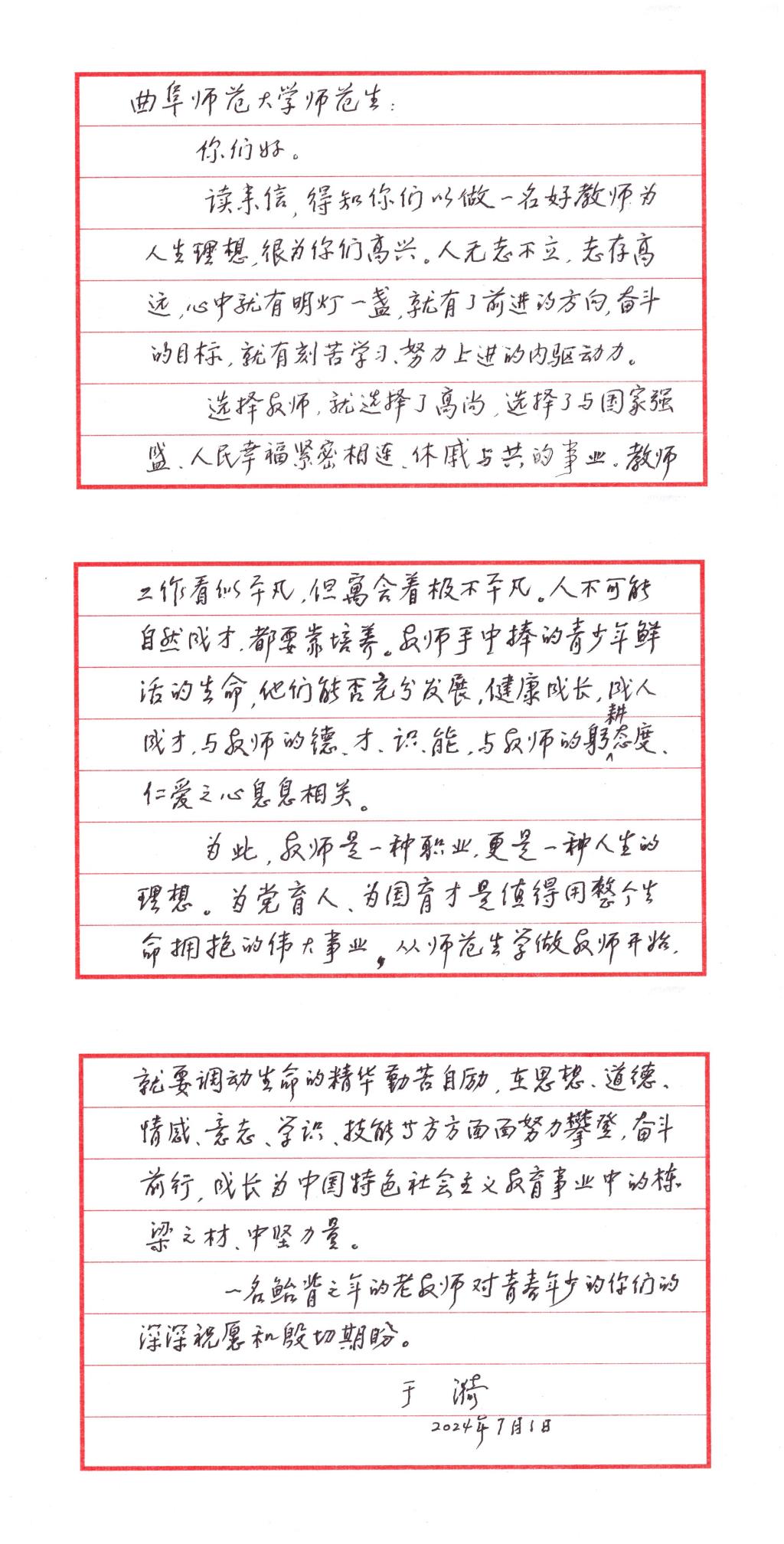 一直以来,大发平台把办好师范教育作为第一职责,充分发挥传统文化优势,着力培养德才兼备的大国良师。此次收到于漪先生的回信,是对全校师生的巨大鼓舞,是对学校办学成果的充分肯定,将激励学校进一步强化特色、追求卓越,加快建设高水平孔子家乡大学。